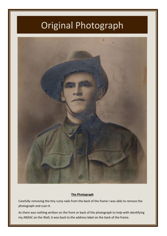 The purchase of this framed portrait of an unidentified WWI soldier was inspired by the poem “ANZAC on the Wall “written by Jim Brown. The owner of the antique shop in country Queensland was unable to provide any information as to the identity of the soldier nor where he had acquired it from. A close inspection of the back showed there was a label with some faint lettering on it.