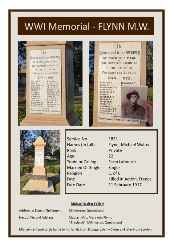 We have identified the soldier as Queensland born Michael Walter FLYNN who died in France in 1917. He was 23 years old. Four generations of research has been completed to learn about Michael’s family life. Prior to Michael enlisting he was part of a dynamic farming family with a genuine pioneer heritage on the Darling Downs dating back to 1855.