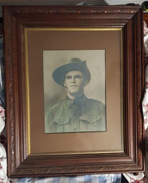 The purchase of this framed portrait of an unidentified WWI soldier was inspired by the poem “ANZAC on the Wall “written by Jim Brown. The owner of the antique shop in country Queensland was unable to provide any information as to the identity of the soldier nor where he had acquired it from. A close inspection of the back showed there was a label with some faint lettering on it.