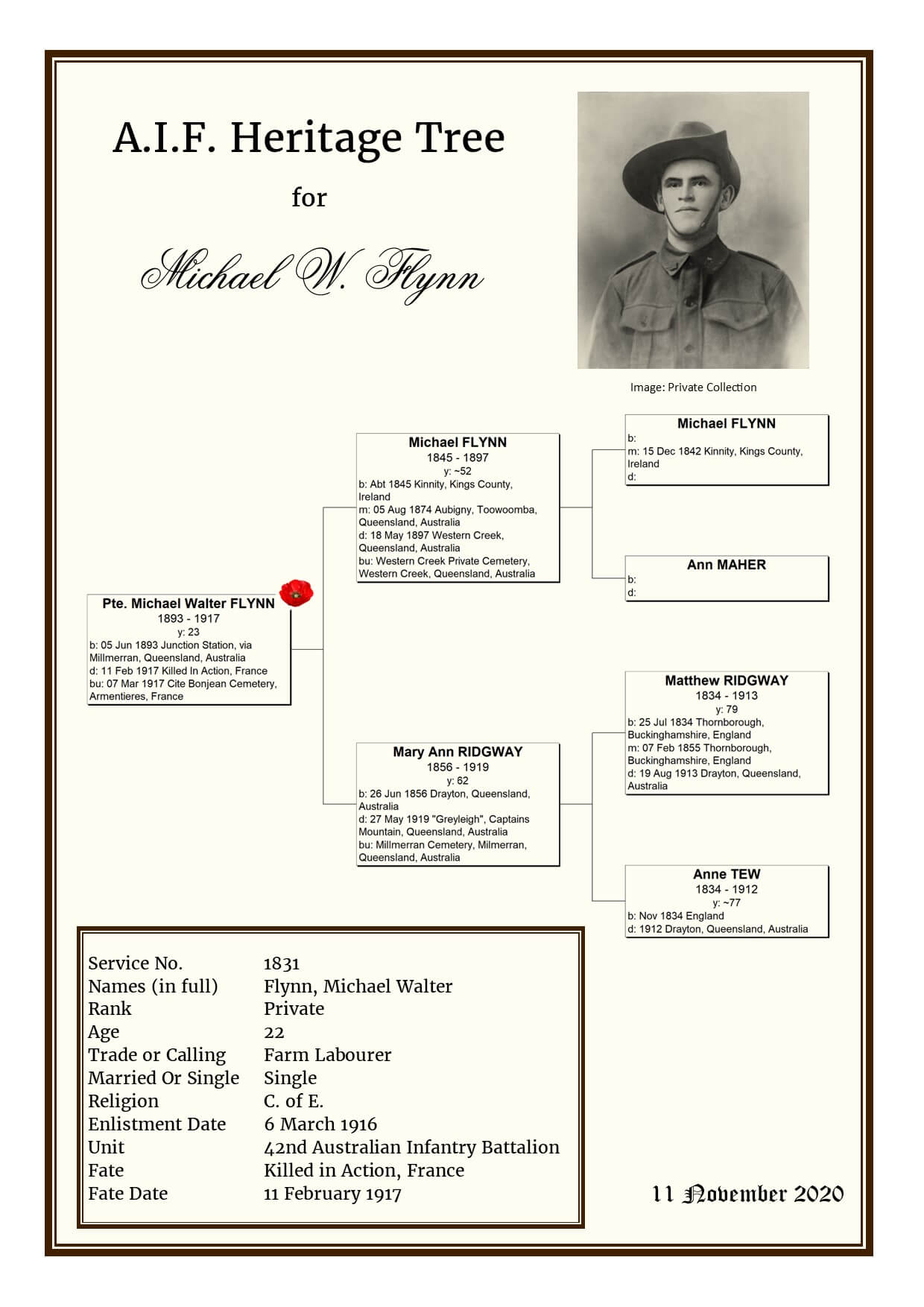 We have been able to complete a four-generation chart for Michael Walter FLYNN and we are proud to present this A.I.F. Heritage Tree in his honour. We will remember him.