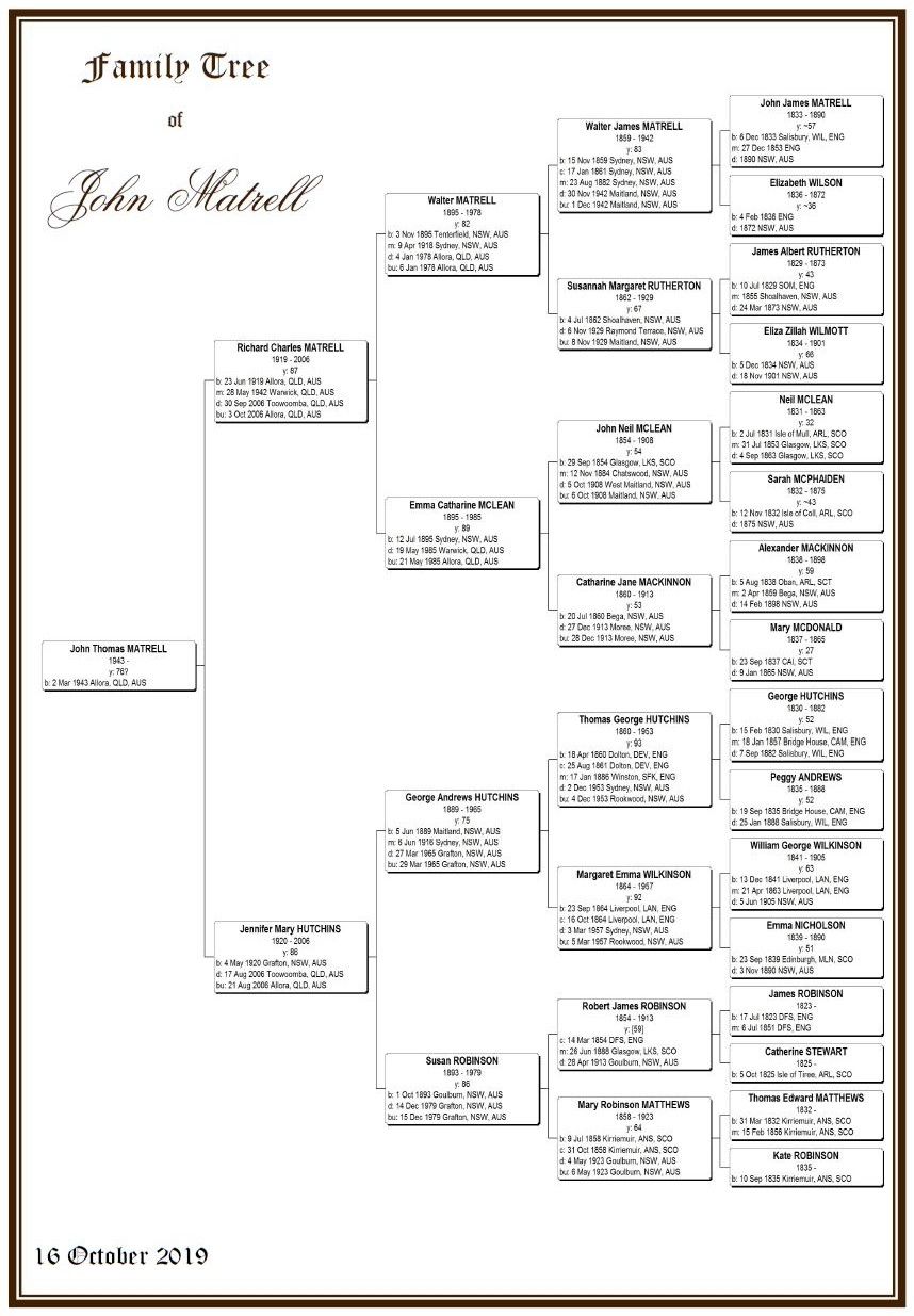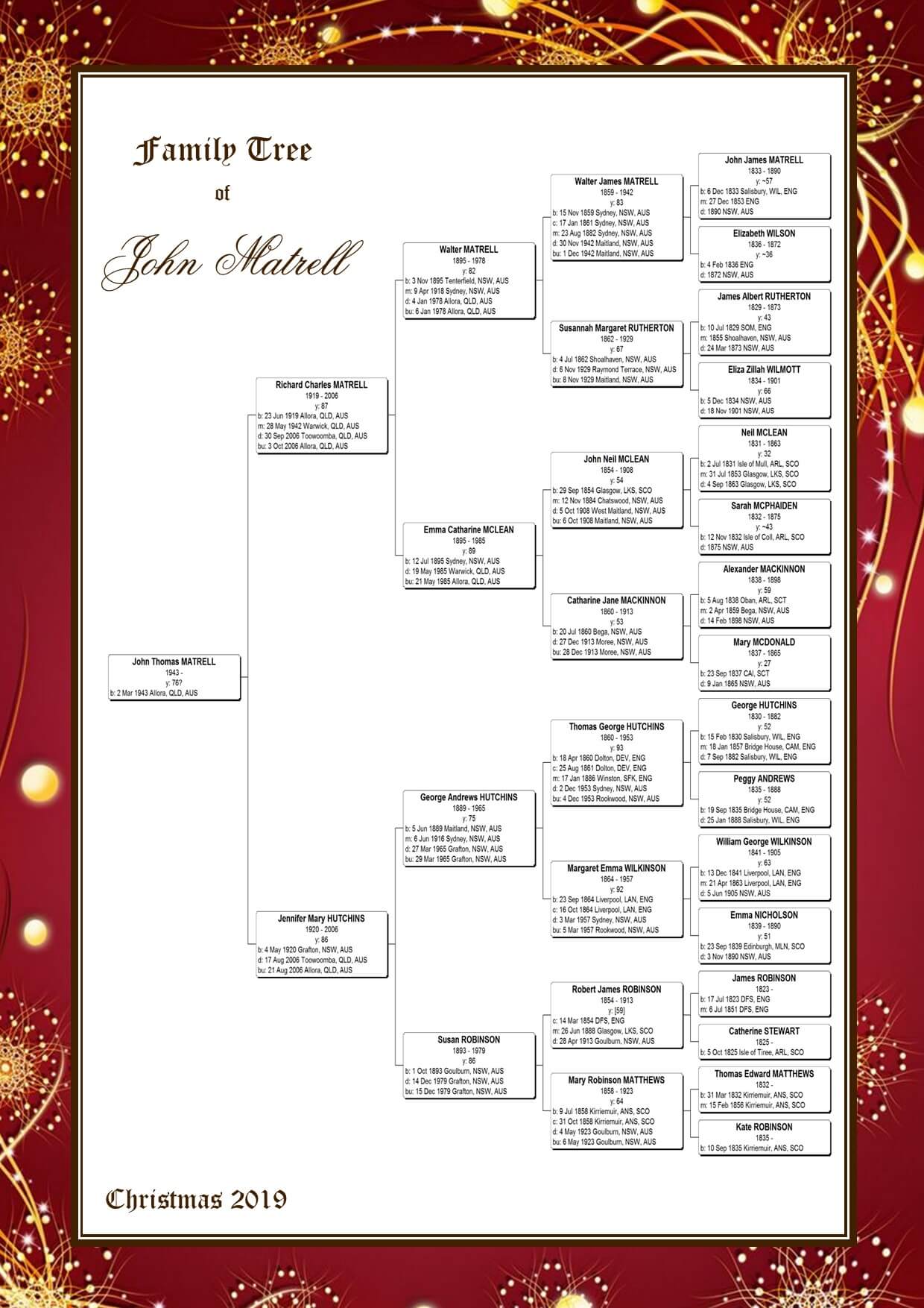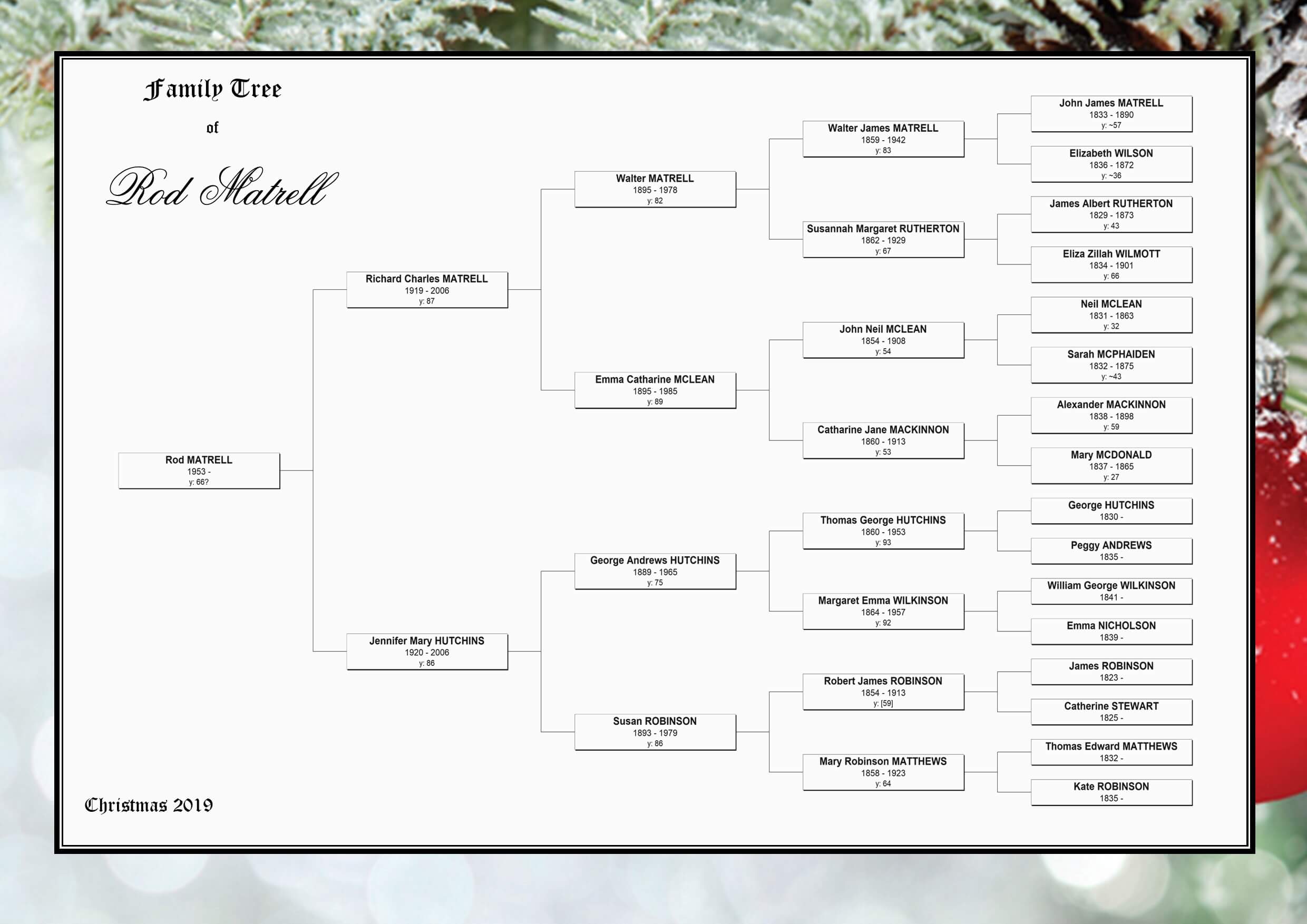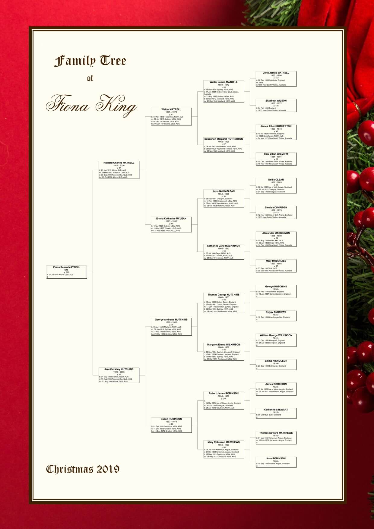 We were able to personalise Christmas Trees for siblings John, Rod and Fiona Matrell with a different border design on each. Rod wanted names and dates without locations on his tree and we included Fiona’s preference to use her married name.
